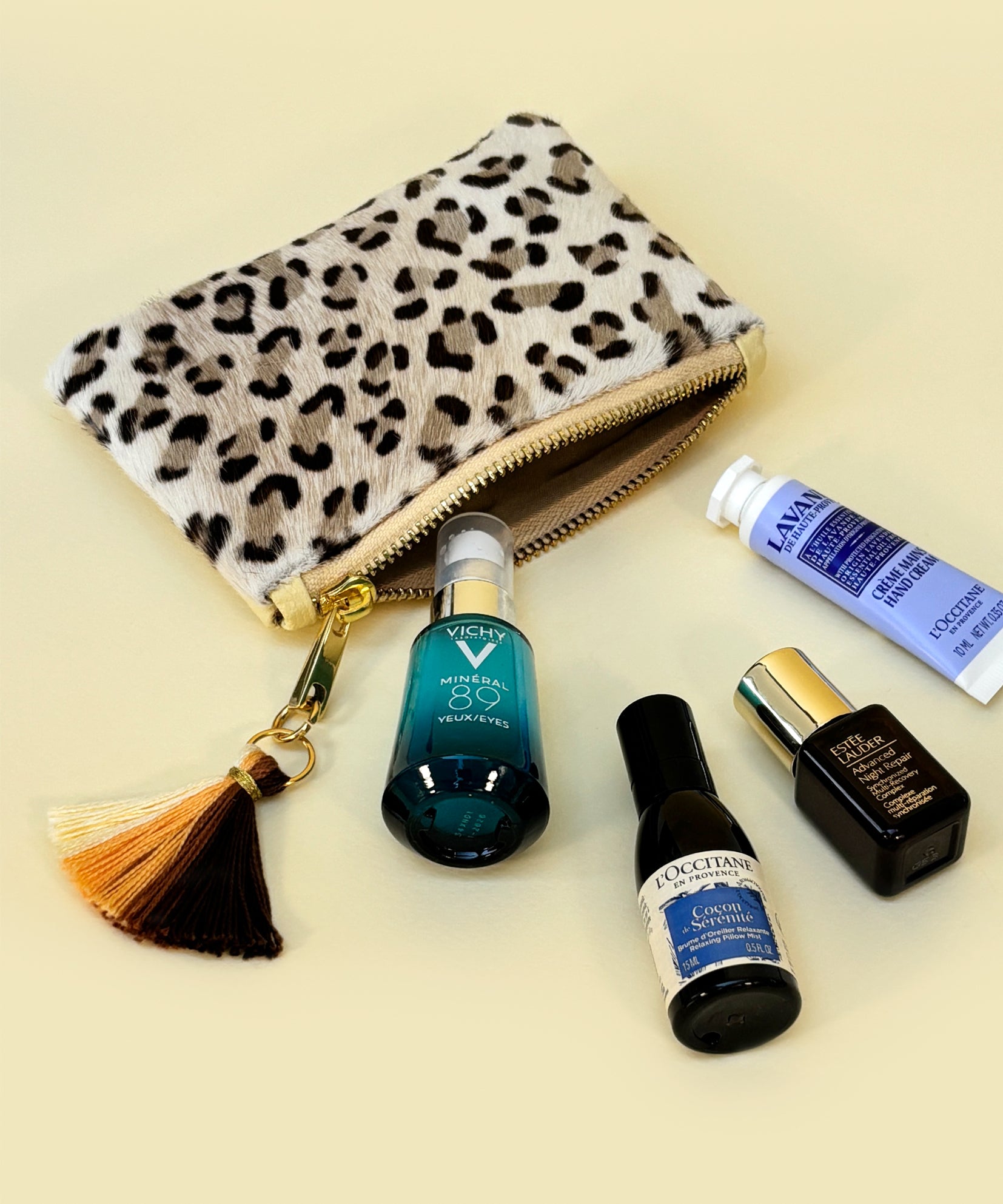 Con forro removible para limpiar y espacio para ubicar botellas de pie, nuestra Maculata makeup bag es el regalo ideal para todas las viajeras y amantes del cuidado personal y la belleza.