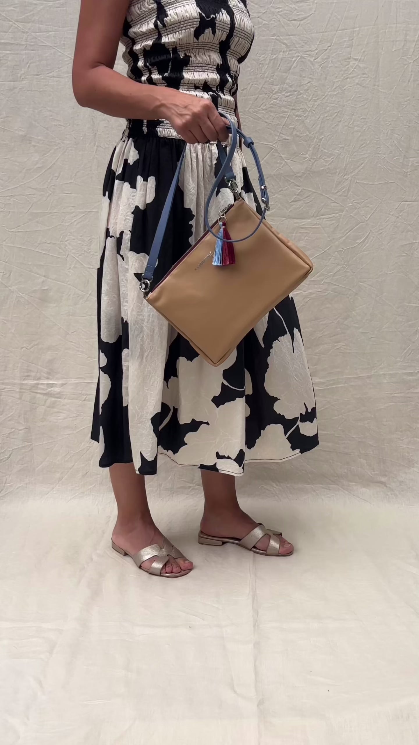 Crossbody Zebra Bloom en cuero de pelo corto con animal print de cebra. Una pieza versátil y sofisticada que combina un estampado atrevido con una paleta de color femenina en sus detalles. Su silueta, con más volumen que un clutch, ofrece gran capacidad para el día a día sin perder la elegancia. Su diseño doble faz te permite llevar dos bolsos en uno: luce el estampado de cebra para un look audaz o voltéalo al lado liso en color khaki para un estilo más sobrio y neutro. Incluye correa ajustable en azul hortensia para llevarlo cruzado o al hombro, añadiendo un acento moderno a tu look.